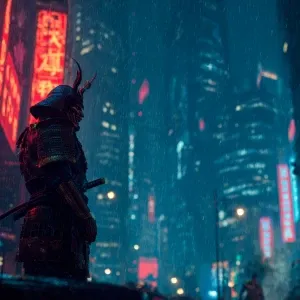 «Amidst a neon-drenched cityscape, a lone samurai warrior stands...»