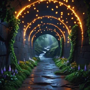 «Inside a firefly-filled tunnel entrance: The tunnel curves gentl...»