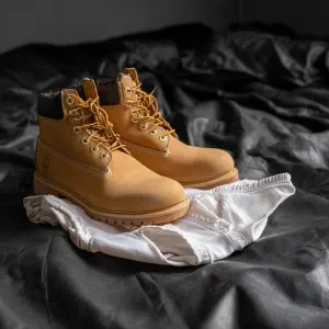 «Make a pair of tan men’s work boots and on top of them a white j...»