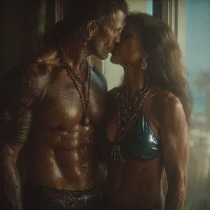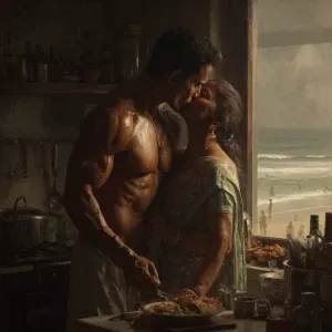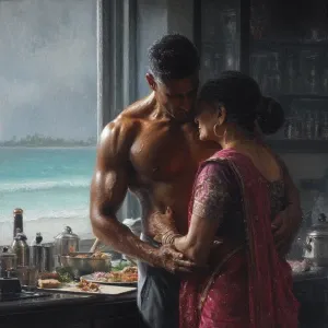 «Hyperrealism.a muscular sweaty indian man standing and kissing...»