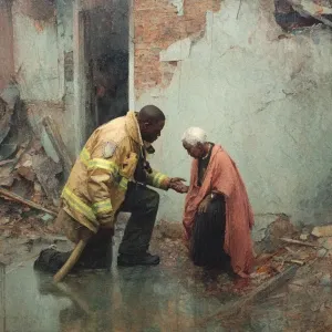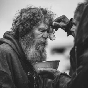 «Giving food to a poor homeless white man in rags»