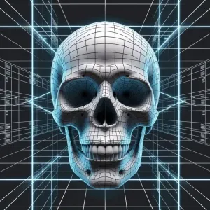 «A wireframe skull surrounded by data grids and scanning beams.»