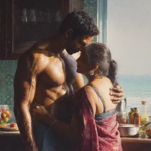 «Hyperrealism.a muscular sweaty indian man standing and kissing...»