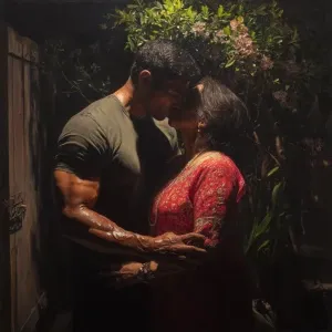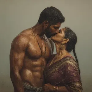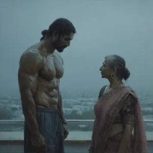 «Hyperrealism painting.a muscular sweaty indian man standing in...»