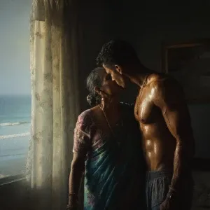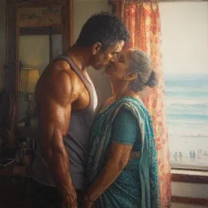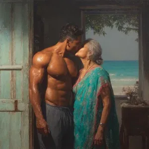 «Hyperrealism.a muscular sweaty indian man standing and kissing...»
