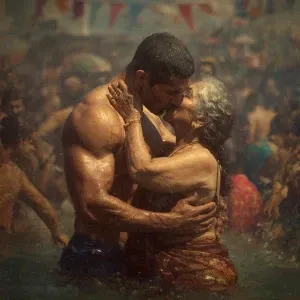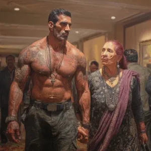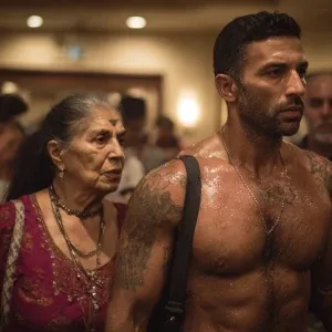 «realism photo painting,A sweaty beefy kashmiri man walking with...»