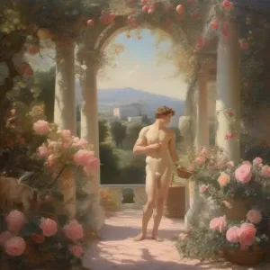 «A Rococo style painting in muted pastel colours of an ethereal,...»