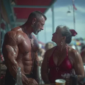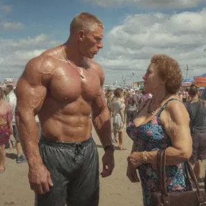 «Hyperrealism photo painting,a muscular sweaty beefy man standing...»