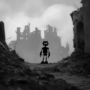 «Small black silhouette of the robot to walk through a ruined cit...»