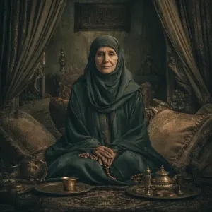 «A gentle-looking elderly Muslim woman wearing a dark green thobe...»