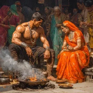 «realism, painting.a beefy muscular sweaty criminal gujarati man...»