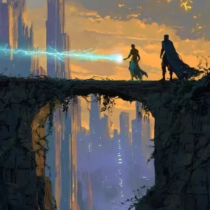 «Create an image of an epic confrontation on an ancient, weathere...»