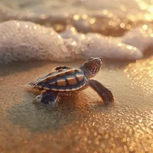«Coco the baby sea turtle on a sandy beach at sunrise, warm golde...»