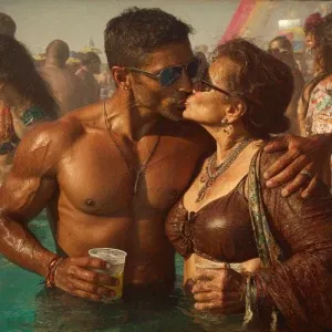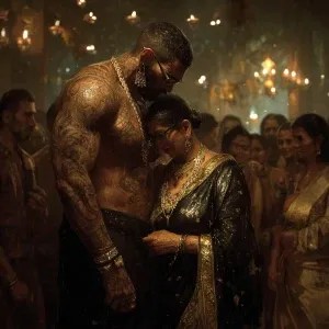 «Realism,--v6.a muscular beefy sweaty tattoed indian man enjoying...»