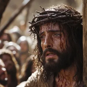 «A close-up, gritty cinematic shot of Jesus's face, etched with p...»