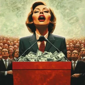 «A woman in a business suit, with an exaggeratedly large mouth, s...»