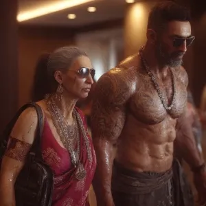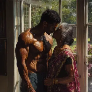 «Hyperrealism .a muscular sweaty indian man standing and kissin...»