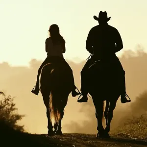 «Silhouette of a father and teenage daughter from behind, riding...»