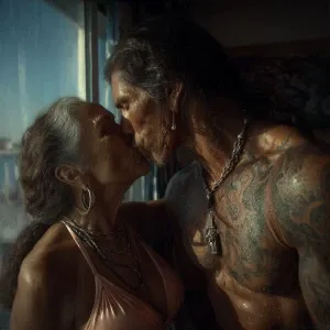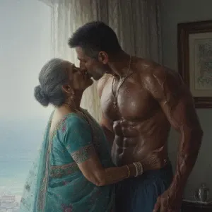 «Hyperrealism.a muscular sweaty indian man standing and kissing...»
