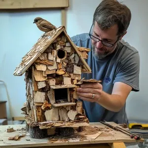 «Give a me hot dad helping their child build a birdhouse that is...»