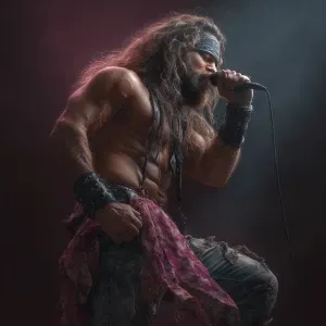 «A rock singer on stage bodybuilder muscle long hair beard funky...»