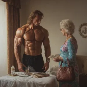 «Hyperrealism painting, a muscular Russian man in his beach hotel...»