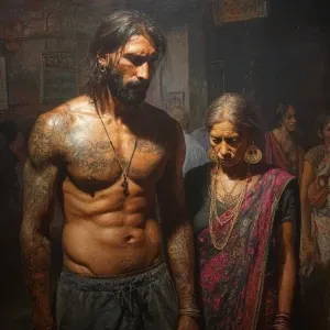 «Hyperrealism painting ,a new delhi muscular beefy bearded tattoe...»