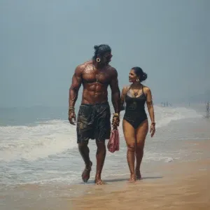 «hyperrealism photo painting.a muscular sweaty villain man, walki...»