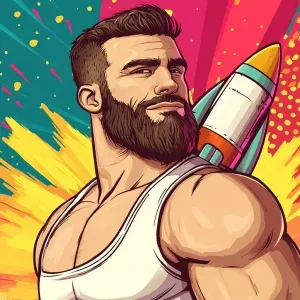 «White muscular thin man with beard, big chin, smile and cheekbon...»
