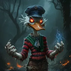 «Anthropomorphic duck character in a dark, haunted forest, glowin...»