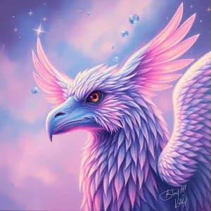 «In a dreamlike haze, a mesmerizing vaporwave-inspired griffin ga...»
