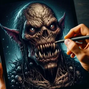 «A hauntingly sinister orc looms in the shadows, its twisted feat...»