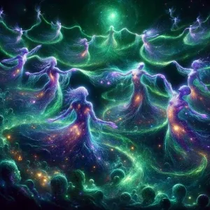 «A celestial dance of shimmering cosmic beings, their bodies swir...»