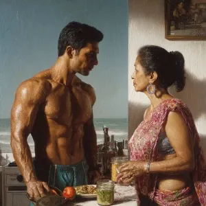 «Hyperrealism digital painting ,a indian muscular beefy sweaty...»