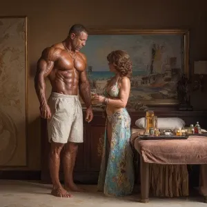 «realism photo painting, a muscular Russian man in his beach hote...»