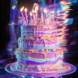 «anthropomorphic birthday cake having a party,glitchcore,hallucin...»