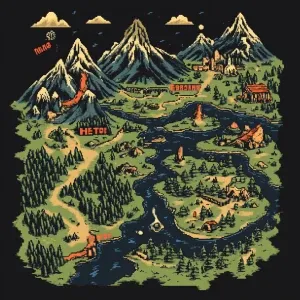 «Create a retro-style fantasy map for a pixel art t-shirt design....»