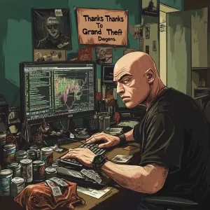 «MEME PEPE in GTA art style, gg, in the style of a Grand Theft A...»