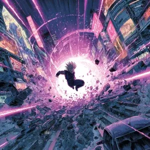 «unleashing a gravity pulse in a neon-lit cityscape, floating abo...»