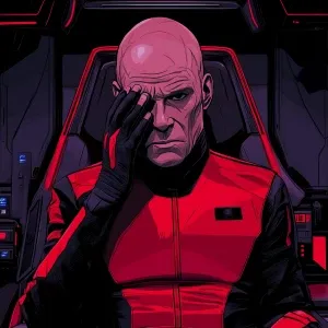 «A muscular man with a stern expression stands in the center of t...»
