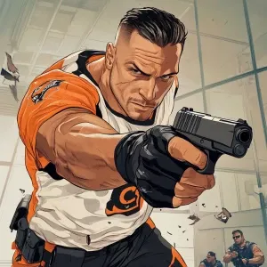 «Create an image of a muscular character dressed in an orange and...»