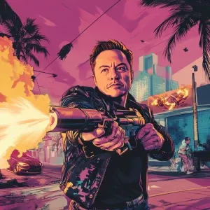 «Elon Musk in GTA art style, Elon is firing rocket launchers dua...»