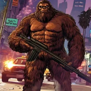«A towering, muscular Bigfoot covered in thick, brown fur, standi...»