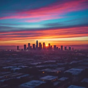 «A panoramic view of Los Angeles during sunset, showcasing the ci...»