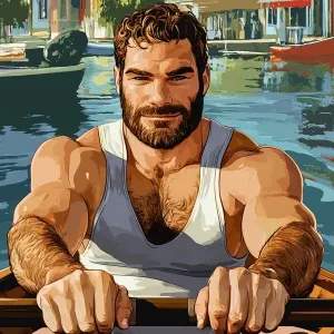 «White muscular thin man with beard, big chin, smile and cheekbon...»