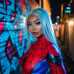 «A young woman with long, straight platinum blonde hair, wearing...»