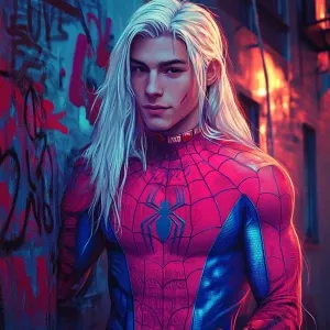 «A character with long, straight, platinum blonde hair and light...»