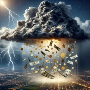 «Thunderstorm raining money and gold coins»