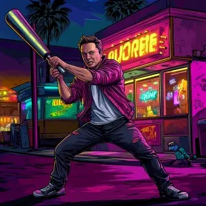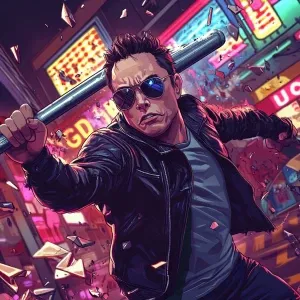 «Elon Musk in GTA art style - mid-swing with a large metal bat, c...»