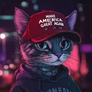 «A humanoid cat character wearing a red baseball cap with "MAKE A...»